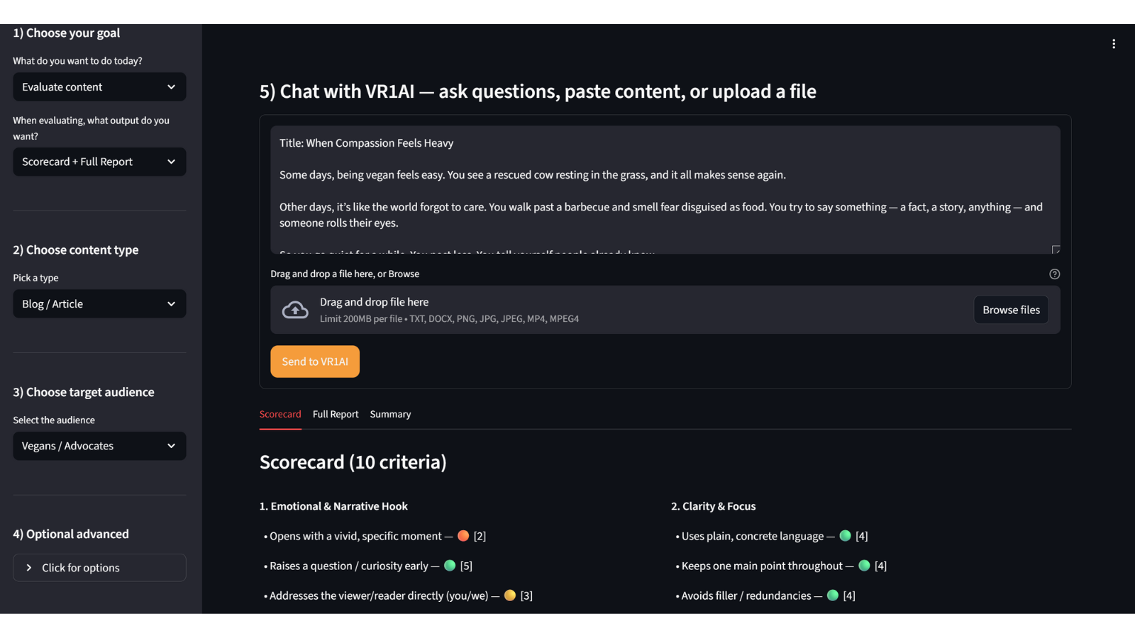 You’ll be able to use VR1AI to evaluate and offer feedback on your existing advocacy content — or to create and co-create new messaging directly with the assistant. Early development already supports written content, and future versions will expand to image and video analysis.
