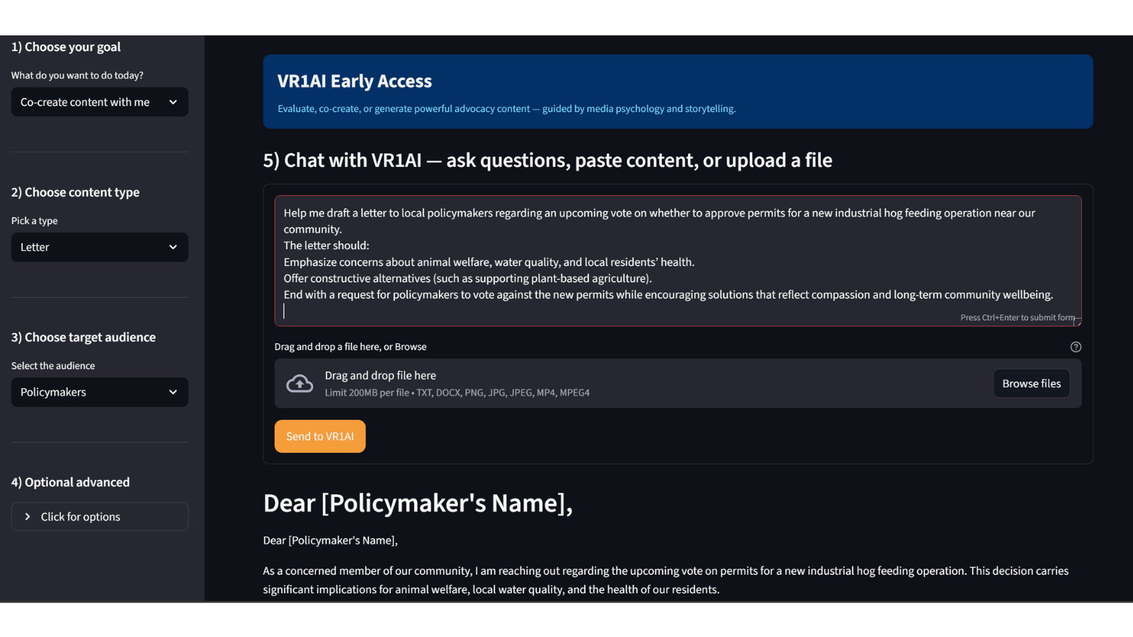 Co-Create with VR1AI – Collaborate with the assistant to craft persuasive, audience-aware advocacy messages.